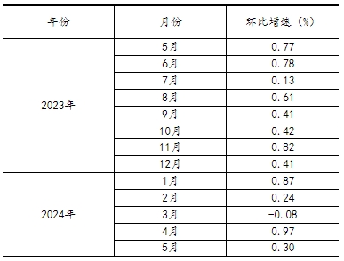 根據季節調整模型自動修正結果,對2023年5月至2024年4月份規模以上工業增加值環比增速進行修訂。修訂結果及2024年5月份環比數據如下: