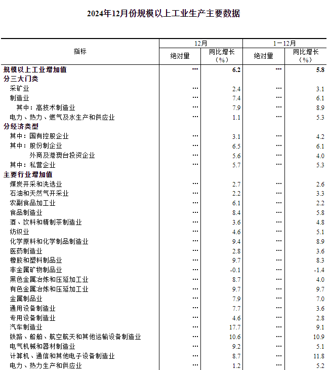 12月份,規模以上工業增加值同比實際增長6.2%(增加值增速均為扣除價格因素的實際增長率)。從環比看,12月份,規模以上工業增加值比上月增長0.64%。2024年,規模以上工業增加值比上年增長5.8%。