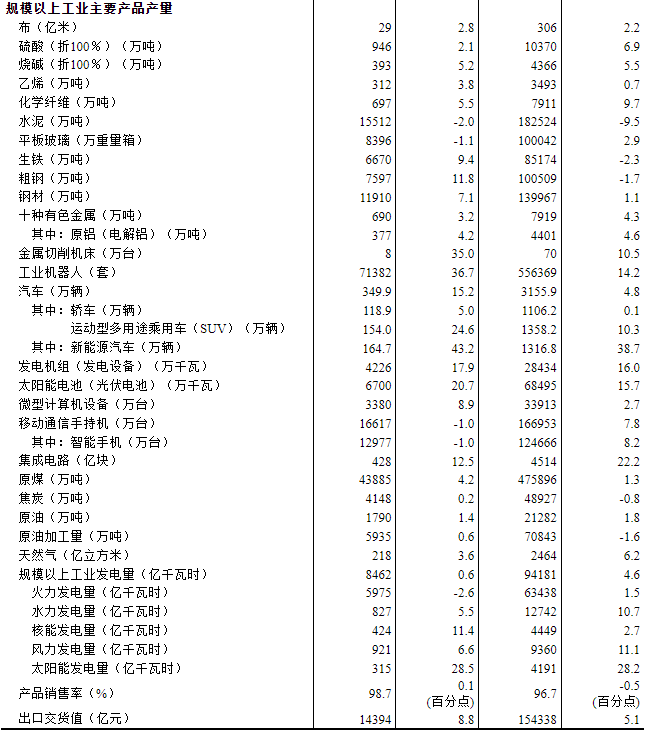 分產品看,12月份,規模以上工業619種產品中有396種產品產量同比增長。其中,鋼材11910萬噸,同比增長7.1%;水泥15512萬噸,下降2.0%;十種有色金屬690萬噸,增長3.2%;乙烯312萬噸,增長3.8%;汽車349.9 萬輛,增長15.2%,其中新能源汽車164.7 萬輛,增長43.2%;發電量8462億千瓦時,增長0.6%;原油加工量5935萬噸,增長0.6%。