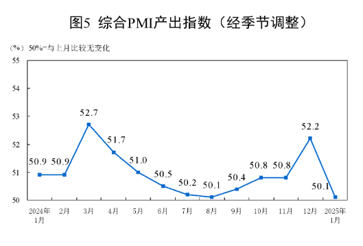1月份,綜合PMI產出指數為50.1%,比上月下降2.1個百分點,表明我國經濟總體產出繼續保持擴張。