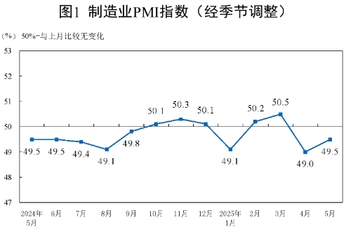 5月份,制造業采購經理指數(PMI)為49.5%,比上月上升0.5個百分點,制造業景氣水平改善。