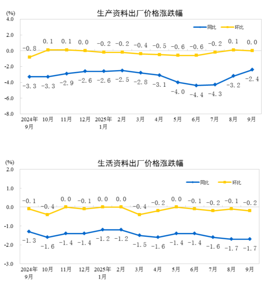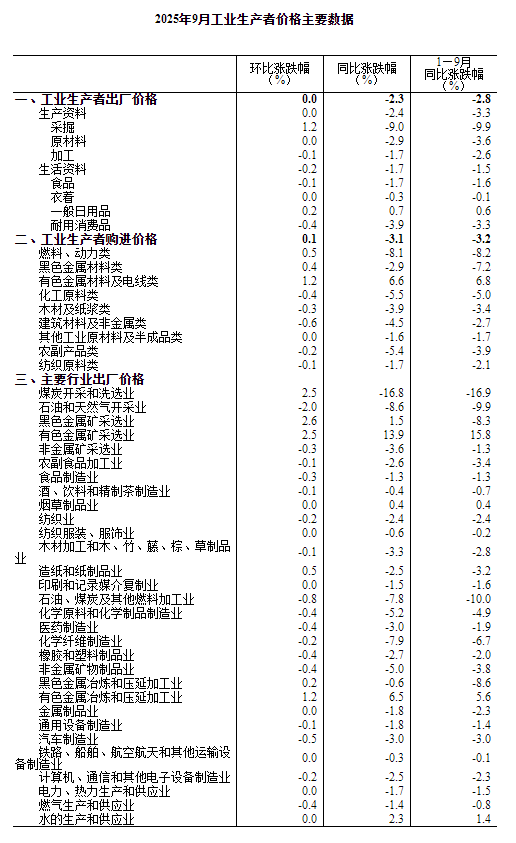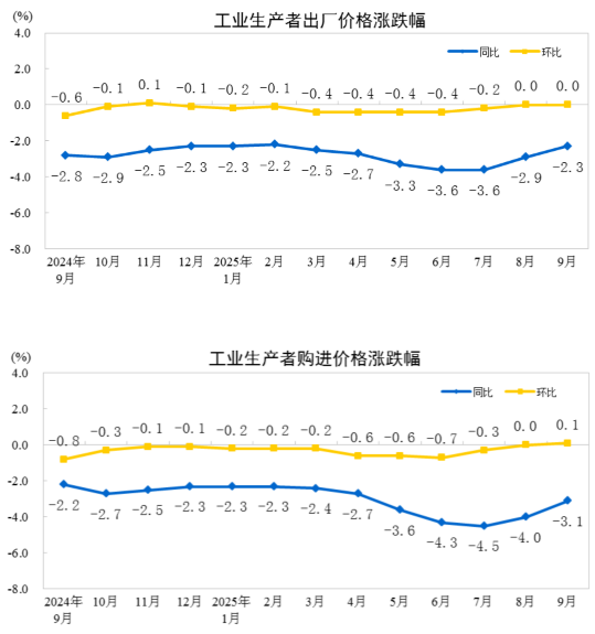 2025年9月份,全國工業生產者出廠價格同比下降2.3%,降幅比上月收窄0.6個百分點,環比繼續持平。工業生產者購進價格同比下降3.1%,降幅比上月收窄0.9個百分點,環比上漲0.1%。1—9月平均,工業生產者出廠價格比上年同期下降2.8%,工業生產者購進價格下降3.2%。