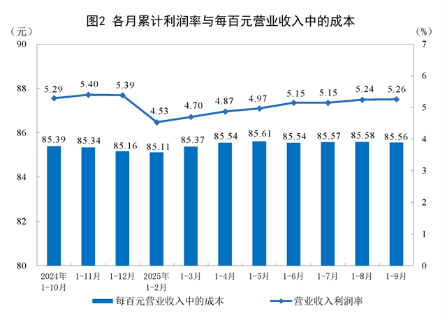1—9月份,規模以上工業企業實現營業收入102.08萬億元,同比增長2.4%;發生營業成本87.34萬億元,增長2.6%;營業收入利潤率為5.26%,同比提高0.04個百分點。