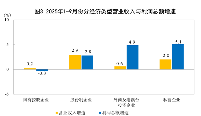 1—9月份,規模以上工業企業中,國有控股企業實現利潤總額17021.8億元,同比下降0.3%;股份制企業實現利潤總額39923.5億元,增長2.8%;外商及港澳臺投資企業實現利潤總額13509.7億元,增長4.9%;私營企業實現利潤總額15131.7億元,增長5.1%。