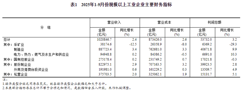 1—9月份,全國規模以上工業企業實現利潤總額53732.0億元,同比增長3.2%(按可比口徑計算,詳見附注二)。