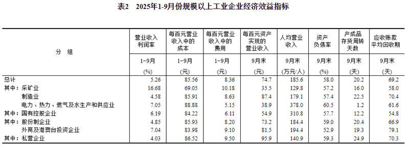 9月末,規模以上工業企業每百元資產實現的營業收入為74.7元,同比減少1.9元;人均營業收入為185.6萬元,同比增加6.2萬元;產成品存貨周轉天數為20.2天,同比增加0.2天;應收賬款平均回收期為69.2天,同比增加3.3天。