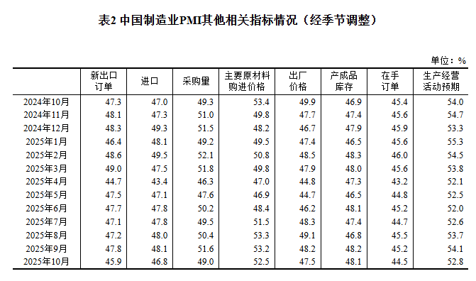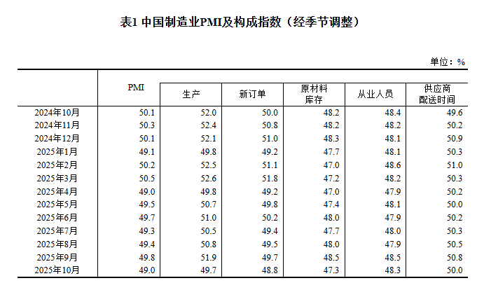 2025年10月中國采購經理指數運行情況
