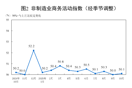 10月份,非制造業商務活動指數為50.1%,比上月上升0.1個百分點,升至擴張區間。