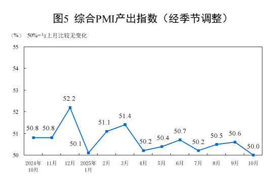 10月份,綜合PMI產出指數為50.0%,比上月下降0.6個百分點,位于臨界點,表明我國企業生產經營活動總體穩定。