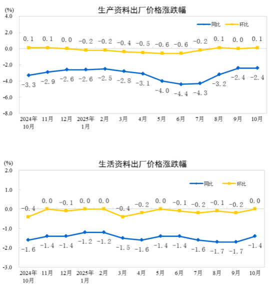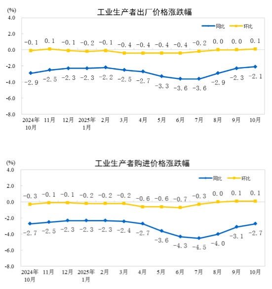 2025年10月份,全國工業生產者出廠價格同比下降2.1%,降幅比上月收窄0.2個百分點;環比由上月持平轉為上漲0.1%。工業生產者購進價格同比下降2.7%,降幅比上月收窄0.4個百分點;環比上漲0.1%,漲幅與上月相同。1—10月平均,工業生產者出廠價格比上年同期下降2.7%,工業生產者購進價格下降3.2%。