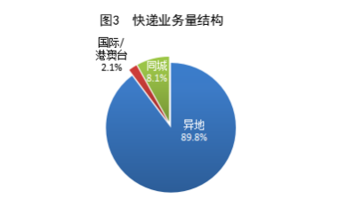1—10月,同城、異地、國際/港澳臺快遞業務量分別占全部快遞業務量的8.1%、89.8%和2.1%。與去年同期相比,同城快遞業務量的比重下降1.0個百分點,異地快遞業務量的比重上升1.1個百分點,國際/港澳臺業務量的比重下降0.1個百分點。