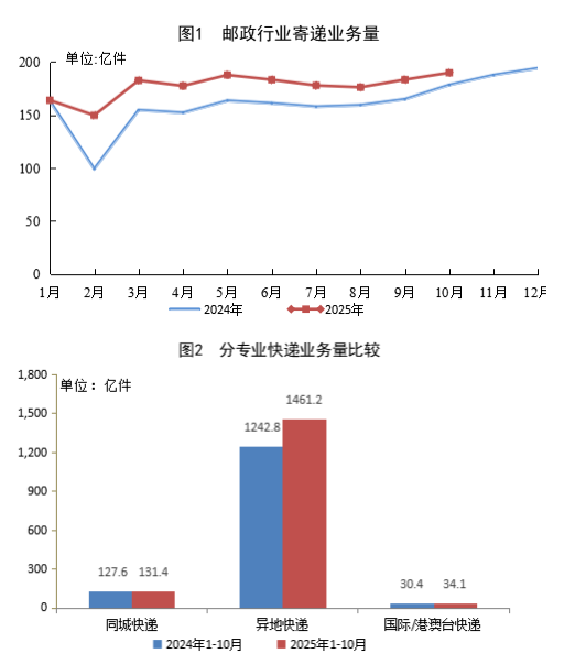 1—10月,同城快遞業務量累計完成131.4億件,同比增長3.0%;異地快遞業務量累計完成1461.2億件,同比增長17.6%;國際/港澳臺快遞業務量累計完成34.1億件,同比增長12.2%。