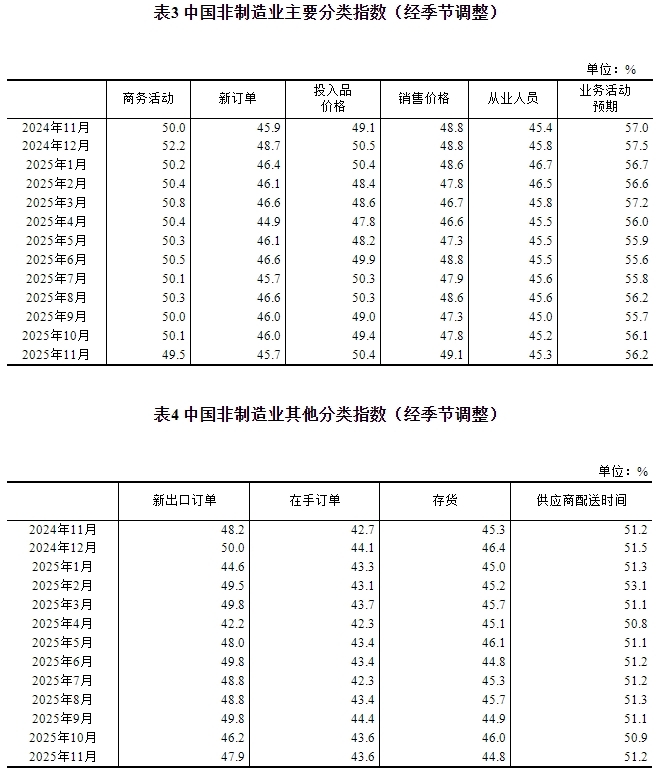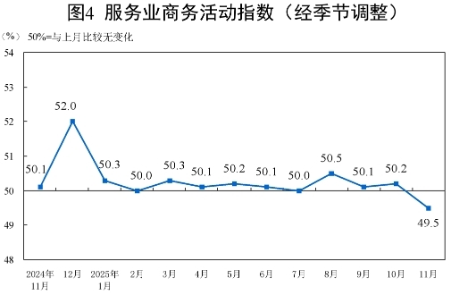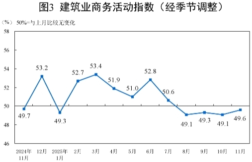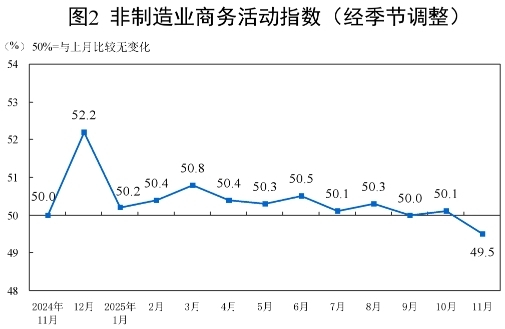 11月份,非制造業商務活動指數為49.5%,比上月下降0.6個百分點。