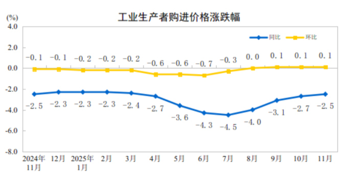 2025年11月份,全國工業生產者出廠價格同比下降2.2%,工業生產者購進價格同比下降2.5%;工業生產者出廠價格和購進價格環比均上漲0.1%,漲幅均與上月相同。1—11月平均,工業生產者出廠價格比上年同期下降2.7%,工業生產者購進價格下降3.1%。