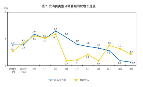 按消費類型分,12月份,商品零售額39398億元,同比增長0.7%;餐飲收入5738億元,增長2.2%。2025年,商品零售額443220億元,比上年增長3.8%;餐飲收入57982億元,增長3.2%。