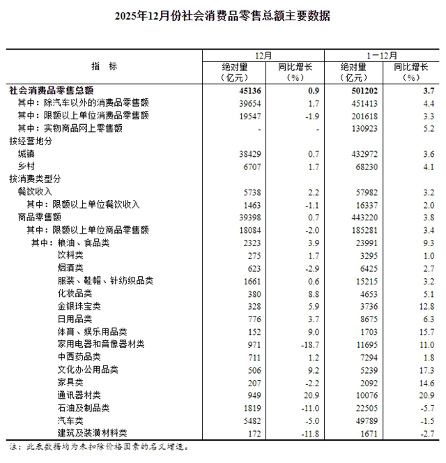 12月份,社會消費品零售總額45136億元,同比增長0.9%。其中,除汽車以外的消費品零售額39654億元,增長1.7%。2025年,社會消費品零售總額501202億元,比上年增長3.7%。其中,除汽車以外的消費品零售額451413億元,增長4.4%。