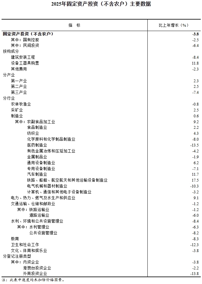 2025年,全國固定資產投資(不含農戶)485186億元,比上年下降3.8%(按可比口徑計算,詳見附注7)。其中,民間固定資產投資比上年下降6.4%。從環比看,12月份固定資產投資(不含農戶)下降1.13%。