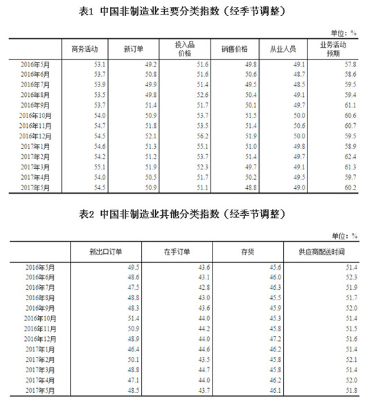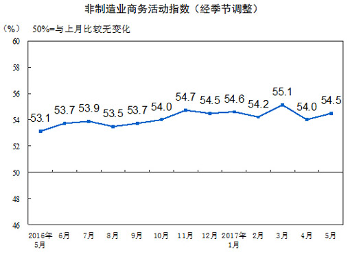 2017年5月份,中國非制造業商務活動指數為54.5%,比上月上升0.5個百分點,位于擴張區間,非制造業繼續保持平穩較快的發展勢頭,增速有所加快。
