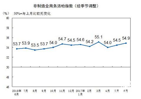 2017年6月份,中國非制造業商務活動指數為54.9%,高于上月0.4個百分點,連續兩個月上升,非制造業延續穩中有升的擴張態勢。