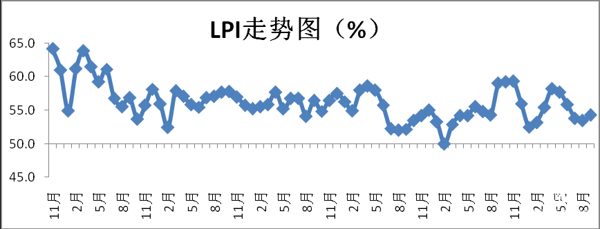 新訂單指數回升,市場需求保持增長。9月份,新訂單指數為54.3%,比上月回升0.8個百分點,顯示出物流市場訂單增加,業務需求旺盛。
