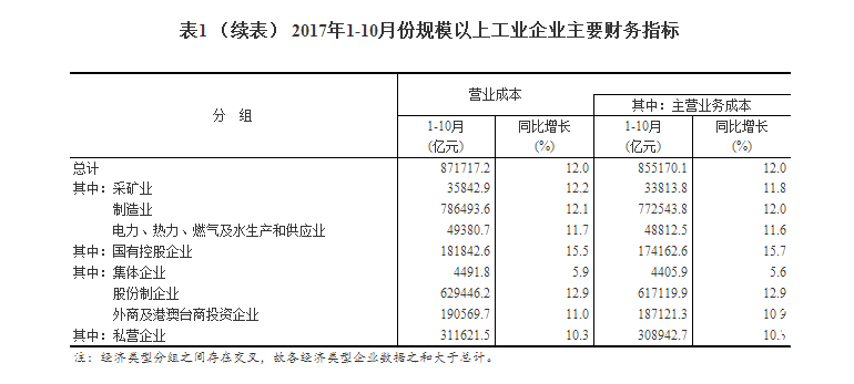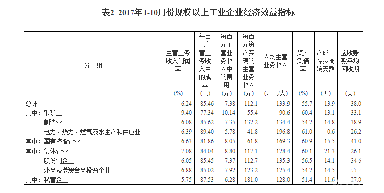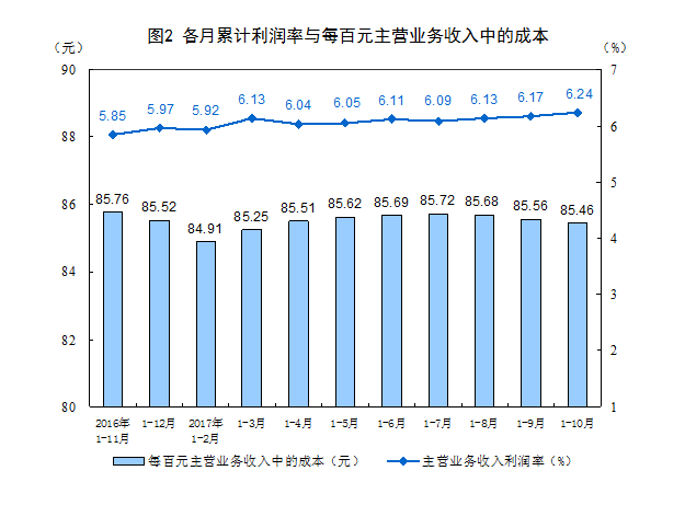 1-10月份,規模以上工業企業實現主營業務收入100.1萬億元,同比增長12.4%;發生主營業務成本85.5萬億元,增長12%;主營業務收入利潤率為6.24%,同比提高0.55個百分點。