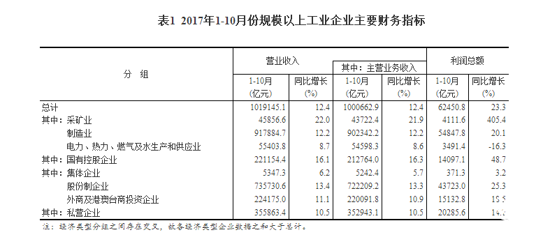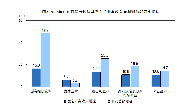 1-10月份,規模以上工業企業中,國有控股企業實現利潤總額14097.1億元,同比增長48.7%;集體企業實現利潤總額371.3億元,增長3.2%;股份制企業實現利潤總額43723億元,增長25.3%;外商及港澳臺商投資企業實現利潤總額15132.8億元,增長18.5%;私營企業實現利潤總額20285.6億元,增長14.2%.
