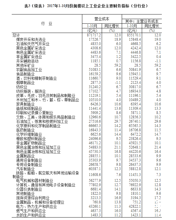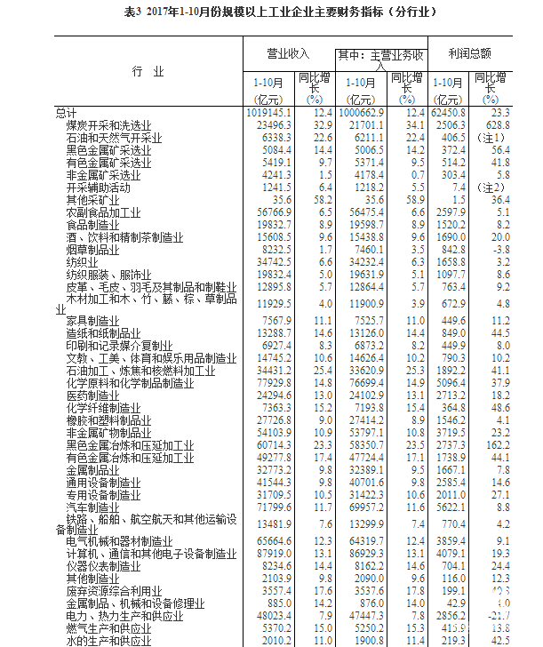 1-10月份,在41個工業大類行業中,38個行業利潤總額同比增加,3個行業減少。主要行業利潤情況如下:煤炭開采和洗選業利潤總額同比增長6.3倍,農副食品加工業增長5.1%,紡織業增長3.2%,石油加工、煉焦和核燃料加工業增長41.1%,化學原料和化學制品制造業增長37.9%,非金屬礦物制品業增長23.2%,黑色金屬冶煉和壓延加工業增長1.6倍,有色金屬冶煉和壓延加工業增長44.1%,通用設備制造業增長14.6%,專用設備制造業增長27.1%,汽車制造業增長8.8%,電氣機械和器材制造業增長9.1%,計算機、通信和其他電子設備制造業增長19.3%,石油和天然氣開采業由同期虧損轉為盈利,電力、熱力生產和供應業利潤總額同比下降21.7%.