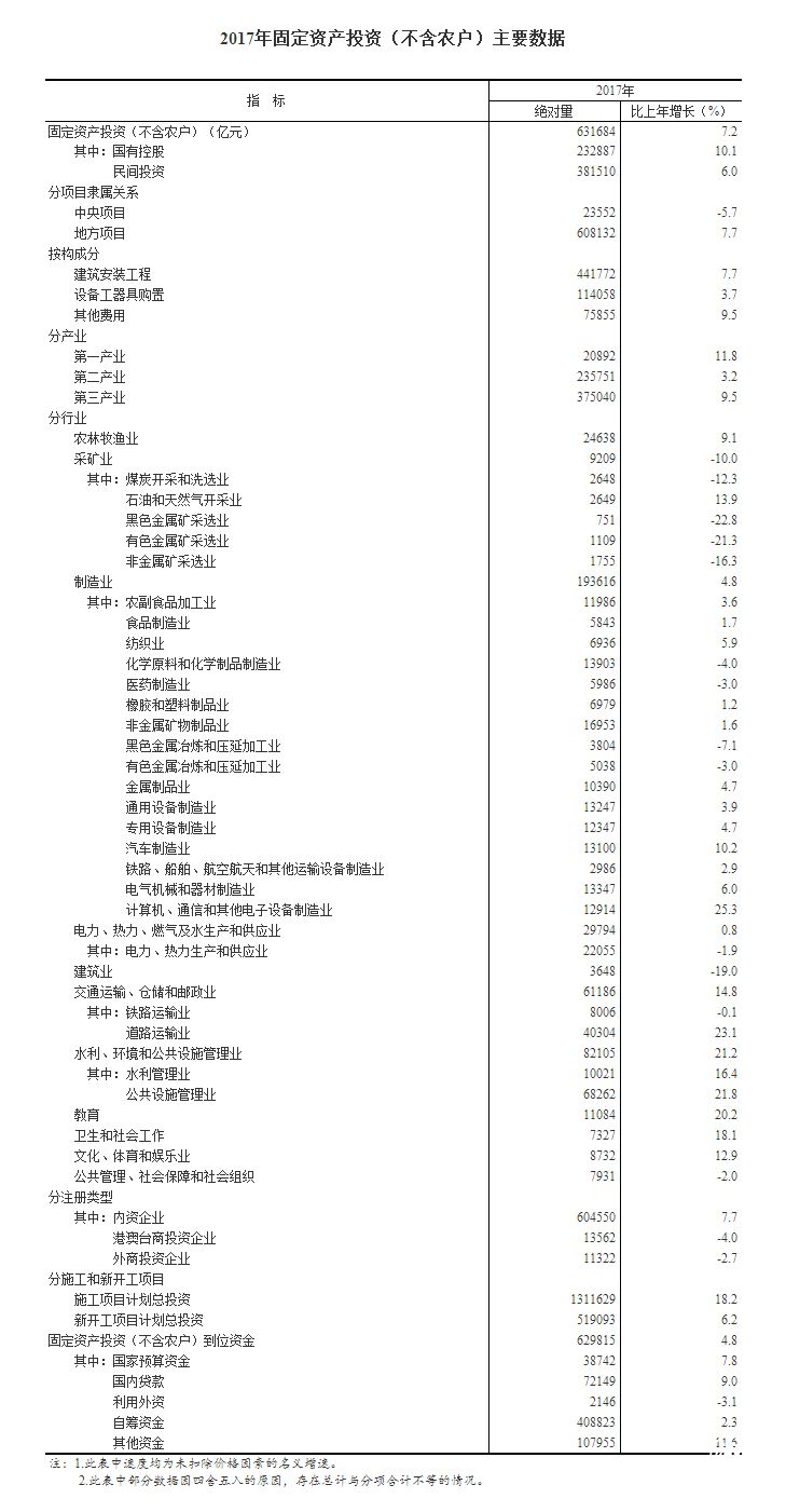 2017年,全國固定資產投資(不含農戶)631684億元,比上年增長7.2%,增速與1-11月份持平。從環比速度看,12月份比11月份增長0.53%。