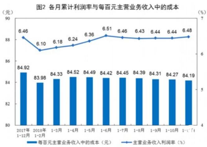 三是成本降低。1-11月份,規模以上工業企業每百元主營業務收入中的成本和費用合計為92.56元,同比降低0.21元;其中,每百元主營業務收入中的成本為84.19元,降低0.21元。