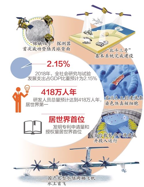 2019年全國科技工作會議9日在北京召開。據悉,2018年,我國科技創新能力大幅增強,主要科技創新指標穩步提升。全社會R&D(研究與試驗發展)支出占GDP比重預計為2.15%。研發人員總量預計達到418萬人年,居世界第一。國際科技論文總量和被引次數穩居世界第二;發明專利申請量和授權量居世界首位。高新技術企業達到18.1萬家,科技型中小企業突破13萬家,全國技術合同成交額為1.78萬億元。科技進步貢獻率預計超過58.5%,國家綜合創新能力列世界第17位。