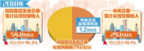 中央企業的表現尤為突出。2018年中央企業累計實現營業收入29.1萬億元,同比增長10.1%;實現利潤總額1.7萬億元,同比增長16.7%;實現凈利潤1.2萬億元,同比增長15.7%。