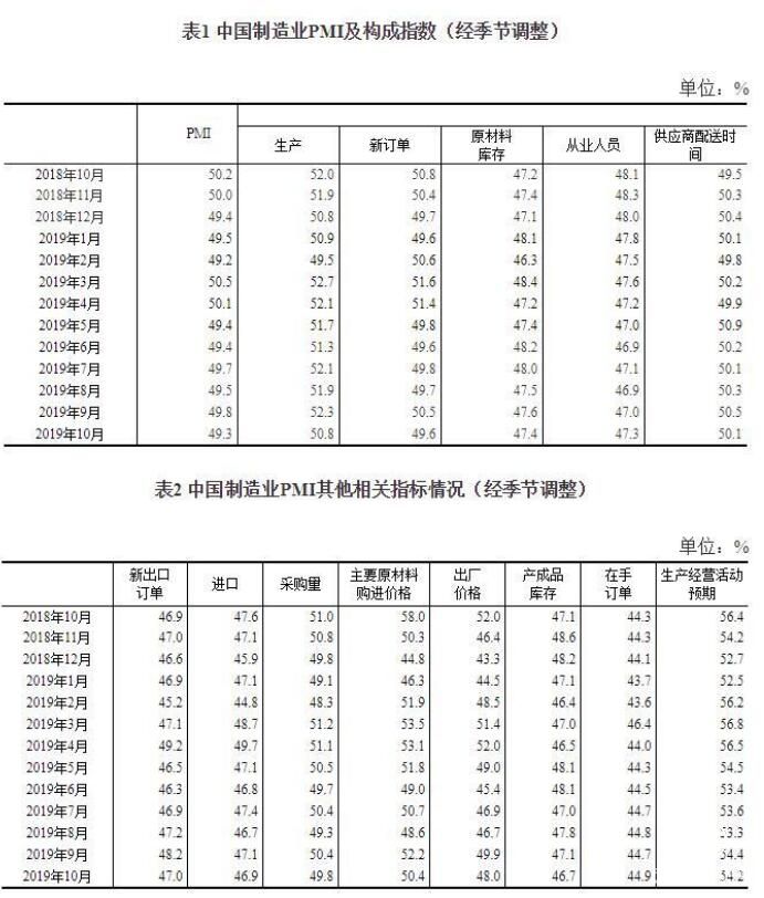 2019年10月份,中國制造業采購經理指數(PMI)為49.3%,比上月下降0.5個百分點。