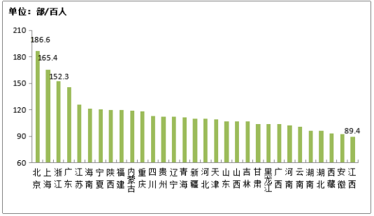 報告稱,全國已有26個省市的移動電話普及率超過100部/百人。固定電話用戶總數1.91億戶,比上年末減少105萬戶,普及率下降至13.6部/百人。