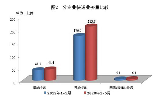 1-5月份,同城、異地、國際/港澳臺快遞業務量分別占全部快遞業務量的16.8%、80.9%和2.3%;業務收入分別占全部快遞收入的9.6%、51.2%和12.1%。與去年同期相比,同城快遞業務量的比重下降1.7個百分點,異地快遞業務量的比重上升1.7個百分點,國際/港澳臺業務量的比重持平。