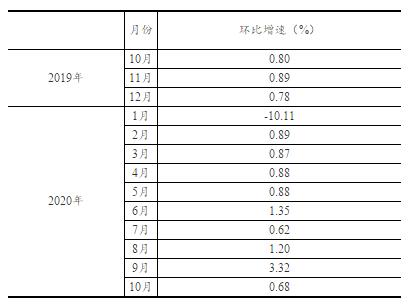 根據季節調整模型自動修正的結果,對2019年10月份以來的社會消費品零售總額環比增速進行修訂。修訂結果及2020年10月份環比數據如下: