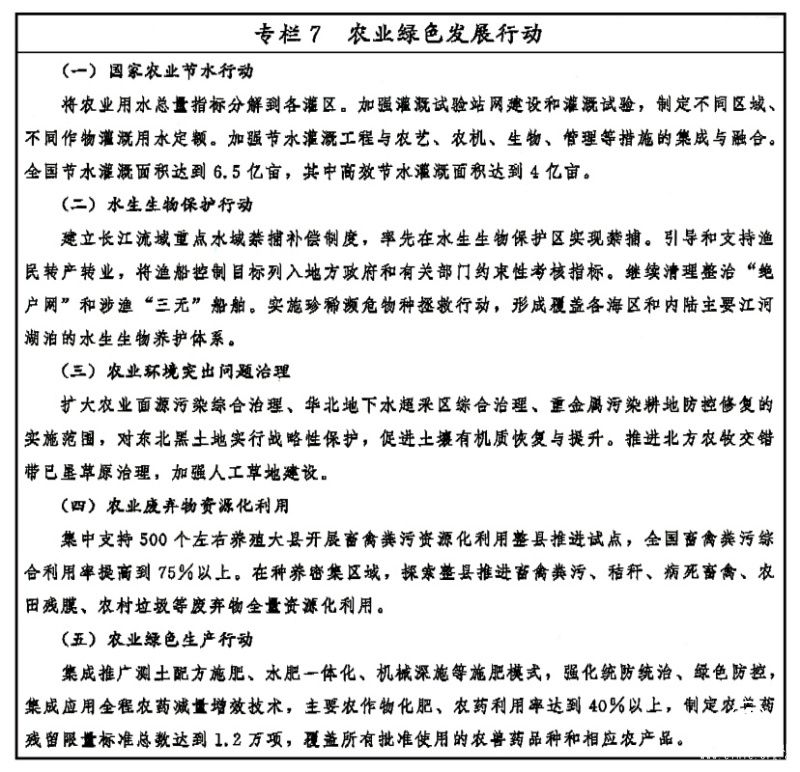 實施國家農業節水行動,建設節水型鄉村。深入推進農業灌溉用水總量控制和定額管理,建立健全農業節水長效機制和政策體系。逐步明晰農業水權,推進農業水價綜合改革,建立精準補貼和節水獎勵機制。嚴格控制未利用地開墾,落實和完善耕地占補平衡制度。實施農用地分類管理,切實加大優先保護類耕地保護力度。降低耕地開發利用強度,擴大輪作休耕制度試點,制定輪作休耕規劃。全面普查動植物種質資源,推進種質資源收集保存、鑒定和利用。強化漁業資源管控與養護,實施海洋漁業資源總量管理、海洋漁船“雙控”和休禁漁制度,科學劃定江河湖海限捕、禁捕區域,建設水生生物保護區、海洋牧場。