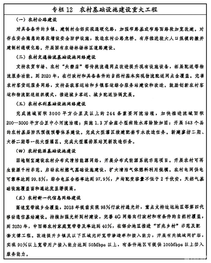 繼續把基礎設施建設重點放在農村,持續加大投入力度,加快補齊農村基礎設施短板,促進城鄉基礎設施互聯互通,推動農村基礎設施提擋升級。