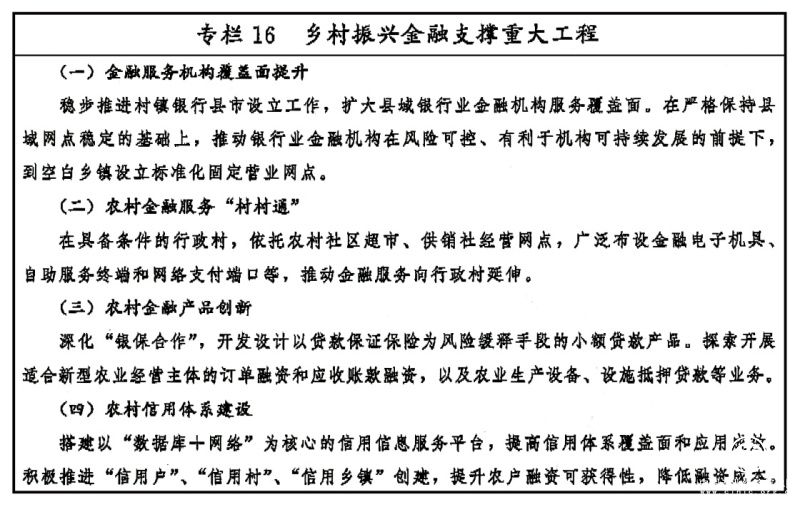 發展鄉村普惠金融。深入推進銀行業金融機構專業化體制機制建設,形成多樣化農村金融服務主體。指導大型商業銀行立足普惠金融事業部等專營機制建設,完善專業化的“三農”金融服務供給機制。完善中國農業銀行、中國郵政儲蓄銀行“三農”金融事業部運營體系,明確國家開發銀行、中國農業發展銀行在鄉村振興中的職責定位,加大對鄉村振興信貸支持。支持中小型銀行優化網點渠道建設,下沉服務重心。推動農村信用社省聯社改革,保持農村信用社縣域法人地位和數量總體穩定,完善村鎮銀行準入條件。引導農民合作金融健康有序發展。鼓勵證券、保險、擔保、基金、期貨、租賃、信托等金融資源聚焦服務鄉村振興。