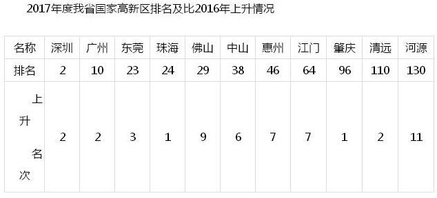 繼廣東區域創新能力綜合排名去年躍居全國首位之后,廣東省在不久前科技部火炬中心通報的2017年度國家高新區評價中再創佳績。記者24日從廣東省科技廳獲悉,廣東省原有的11個國家高新區排名全部實現提升,深圳高新區躍居全國第二,廣州高新區進入全國前十。新增汕頭、湛江、茂名3家國家級高新區,目前廣東省國家級高新區已達到14家。
