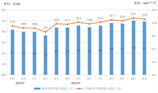 移動互聯網流量增速持續提升,11月戶均移動互聯網接入流量(DOU)小幅降低。1-11月,移動互聯網累計流量達49.4億GB,同比增長16.5%。11月當月DOU為12.9GB/戶·月,較上月降低0.2GB/戶·月,較上年同期增長13.8%。