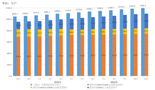 固定寬帶接入用戶增速穩定,千兆用戶數穩定提升。截至11月末,三家基礎電信企業的固定互聯網寬帶接入用戶總數達1196.4萬戶,同比增長13.1%,較上年末增長125.2萬戶。其中,光纖接入(FTTH/O)用戶1145.6萬戶,占固定互聯網寬帶接入用戶總數的95.8%;100Mbps及以上接入速率的固定互聯網寬帶接入用戶達1100.1萬戶,占總用戶數的比重為92.0%;500Mbps及以上接入速率的固定互聯網寬帶用戶達354.9萬戶,占總用戶數的比重為29.7%;1000Mbps及以上接入速率的固定互聯網寬帶接入用戶為258.6萬戶,占總用戶數的比重為21.6%。