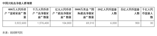 資料顯示,中國大陸目前資產超過600萬元的家庭有392.26萬戶,擁有千萬人民幣資產的家庭有157.6萬戶,資產過億的家庭有10.48萬戶,資產超過20億人民幣的富豪有6000人,資產超過百億的富豪有900人,資產超過千億的有30人。