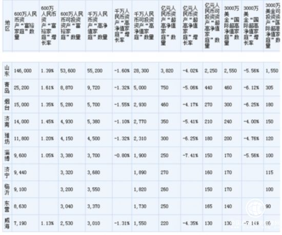 北京是擁有最多600萬資產“富裕家庭”的地區,達到70.4萬戶,廣東第二,600萬資產“富裕家庭”達到67.9萬戶;上海第三,600萬資產“富裕家庭”達到60.2萬戶。浙江、江蘇分別為51.6萬戶、29.0萬戶。報告顯示,山東位列大陸地區第六名,600萬資產“富裕家庭”達到14.6萬戶,增幅1.39%;擁有千萬可投資資產的“高凈值家庭”數量有55.2萬戶,另外擁有億元可投資資產的“超高凈值家庭”數量有3820戶。(孟煥然)