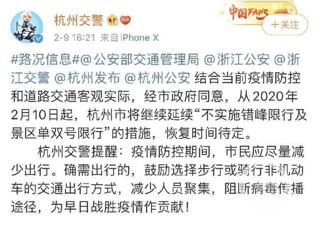 2月9日,杭州交警通過官方微博發布消息稱,結合當前疫情防控和道路交通客觀實際,經杭州市政府同意,從2月10日起,杭州市將繼續延續“不實施錯峰限行及景區單雙號限行”的措施,恢復時間待定。并提醒市民盡量減少出行,確需出行的,鼓勵選擇步行或騎行非機動車的交通出行方式。