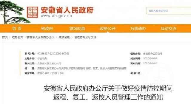 ▲2月9日,安徽省發布通知對返程、復工、返校等提出明確要求。安徽省政府官網截圖