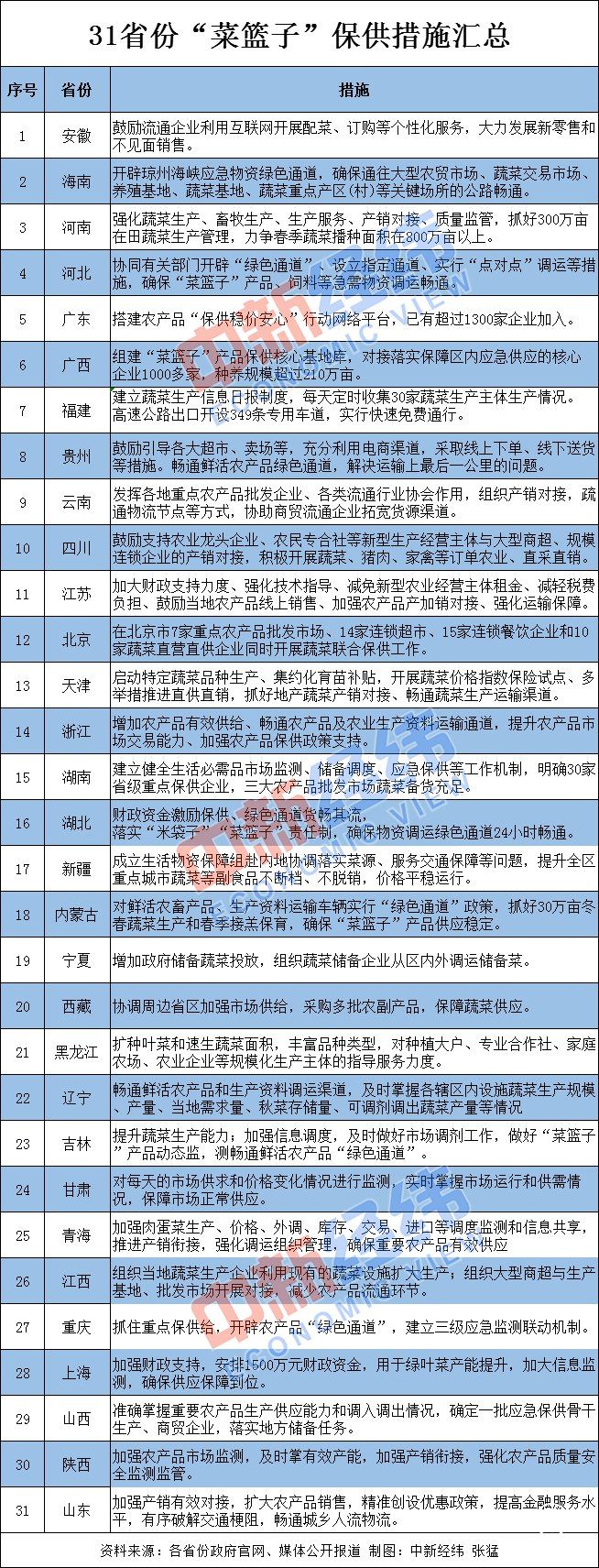 在地方層面上,31省份通過鼓勵農產品線上銷售、暢通運輸“綠色通道”、抓好產品產銷對接、加大財政支持力度等措施全力守護民眾的“菜籃子”。