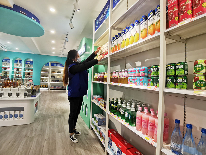 11月5日,在青銀高速濟南東服務區的“齊魯號全球購”線下直營店,工作人員整理來自“一帶一路”沿線國家的特色商品。新華社記者 陳灝 攝