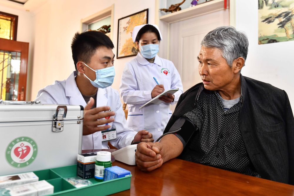 10月29日,在棗莊市臺兒莊區澗頭集鎮旺莊村,澗頭集鎮中心衛生院家庭醫生為村民量血壓。近年來,山東省大力推動民生保障和城鄉均衡“上臺階”,不斷將教育、醫療、衛生等優質資源下沉到最基層,增進群眾的獲得感和幸福感。新華社記者 郭緒雷 攝
