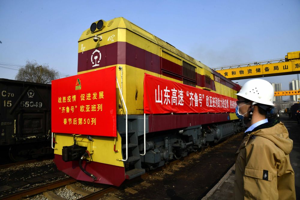 2月21日,在濟南(國儲)鐵路國際站場,山東高速集團“齊魯號”歐亞班列緩緩駛出站場。前三季度,山東歐亞班列開行次數同比增長46%,實際利用外資同比增長27.9%。新華社記者 郭緒雷 攝
