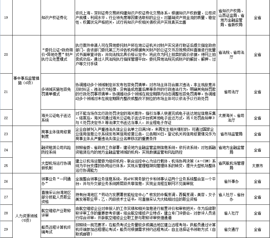 包括“委托公證+政府詢價+異地處置”財產執行云處置模式、多領域實施包容免罰清單模式、海關公證電子送達系統、商事主體信用修復制度、融資租賃公司風險防控系統、大型機場運行協調新機制等6項。